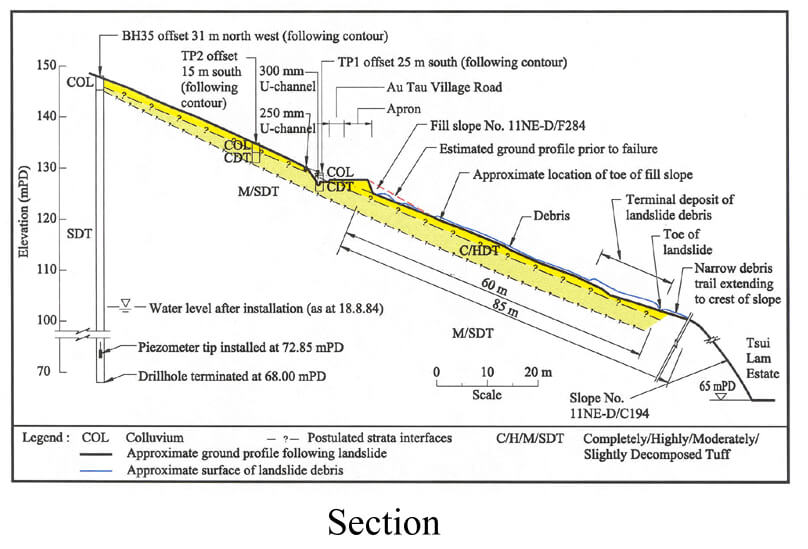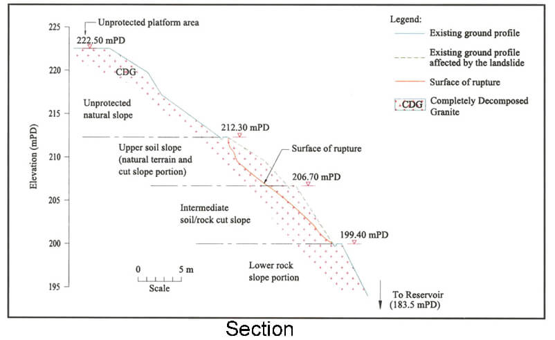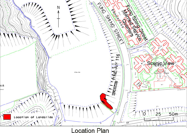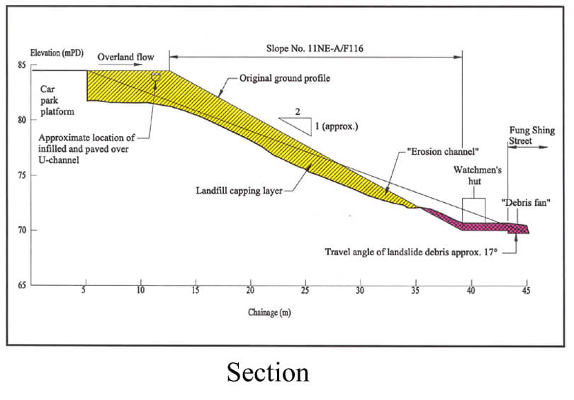 The slope has a history of past failures involving small slips and erosion. There is evidence that settlement of the landfill has occurred with time. This resulted in distress of the slope and could have adversely affected the surface flow regime of the paved platform above. At the time of the landslide, the responsibility for slope maintenance rests with the Short Term Tenancy (STT) tenant.
