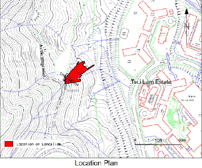 The landslide involved the failure of an old fill slope below a minor road during severe rainfall (estimated return period of 18 years). The fill slope was formed by illegal dumping between 1976 and 1991. The open space within Tsui Lam Estate at the toe of the slope was temporarily closed to public following the landslide. No fatalities or injuries were reported as a result of the incident.