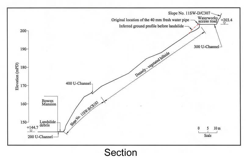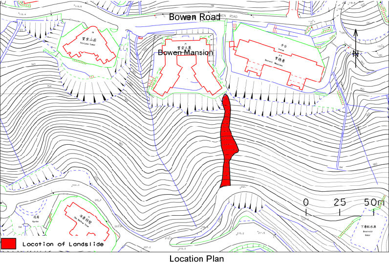 The landslide affected a portion of natural hillside that does not have any obvious evidence of past failures over the last several decades based on aerial photographs. The landslide debris travelled down the hillside and was deposited at the rear yard of a building at Bowen Road. There were no casualties caused by the landslide but some parts of the building suffered minor damage.