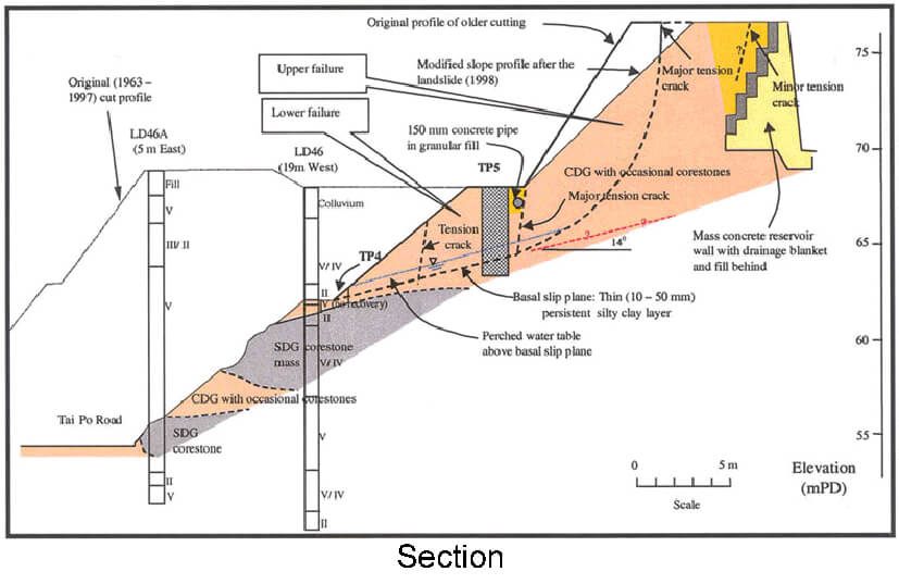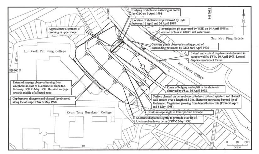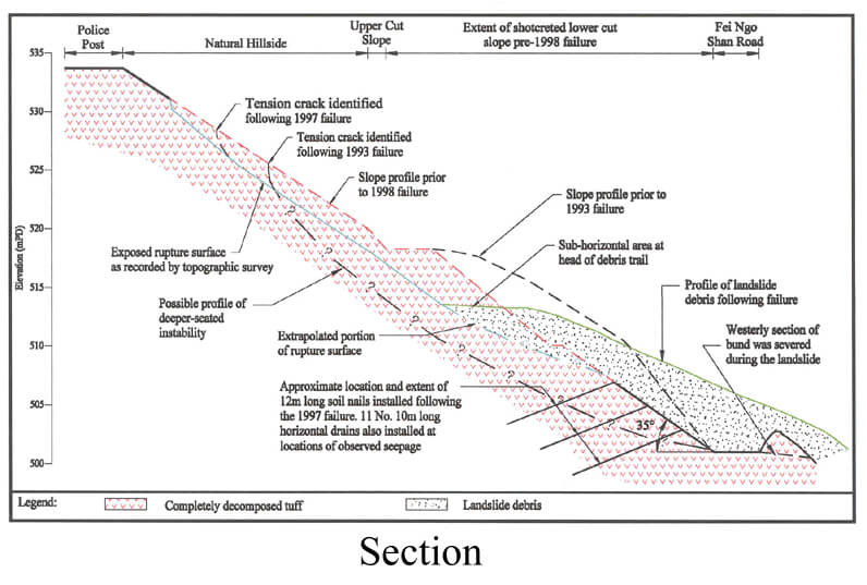 The 1998 landslide affected the upper part of the cut slope above the soil-nailed portion, together with the hillside above. The failure involved fast-moving debris. There is evidence that the previously observed tension cracks in the ground above the cut slope were not sealed properly. The debris from the 1998 landslide was more mobile than the past instabilities. The travel angle of the debris was about 30°.