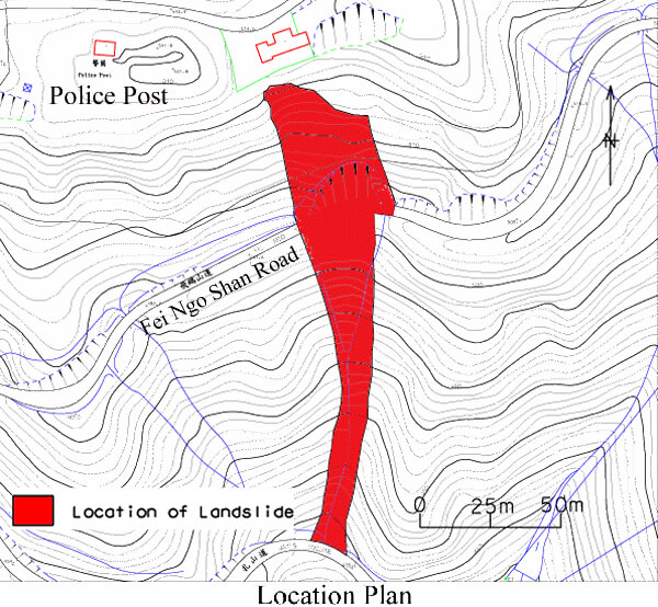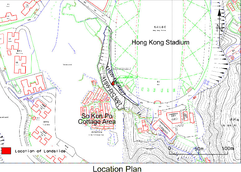 The landslide occurred in an oversteep (65o-75o) soil portion of a soil/rock cut slope. The failed area had a history of instabilities. The landslide debris partially blocked the perimeter access road of the Hong Kong Stadium. No casualties resulted from the landslide.