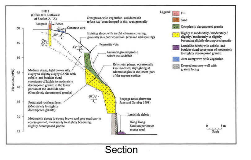 The failed slope was within the boundary of the Hong Kong Stadium redevelopment project in 1993. The design (involving cutting back) was accepted by the Geotechnical Engineering Office (GEO). However, the proposed upgrading works at the failed area were not carried out during construction as the consultant to the project considered (incorrectly) that this section of slope was in rock. No as-built drawings were submitted to the GEO on completion of slope upgrading works at the subject feature.
