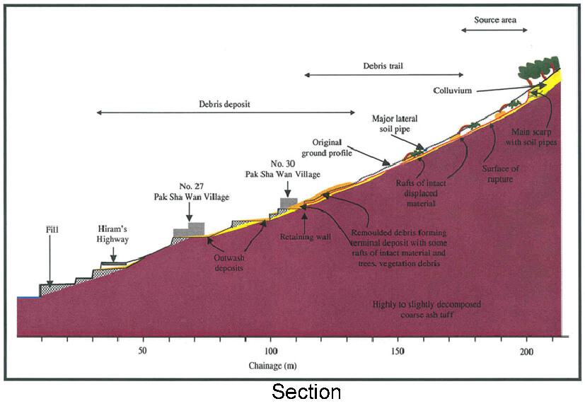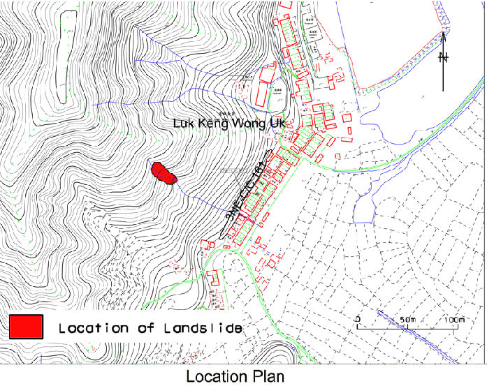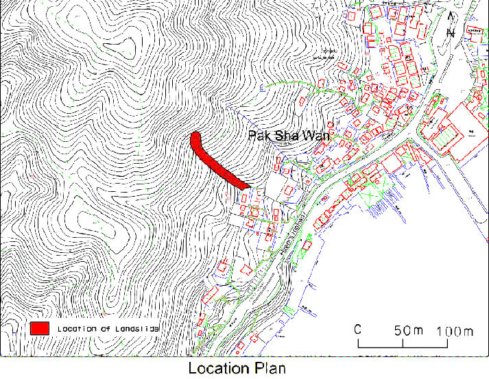 The landslide debris travelled along a streamcourse as a channelised debris flow. The travel angle of the debris was about 23o and it affected the open areas of some dwellings within the village at the toe of the hillside. The village was previously subjected to a Non-Development Clearance (NDC) inspection. Some of the domestic houses are not classified as squatters and have not been recommended for clearance.