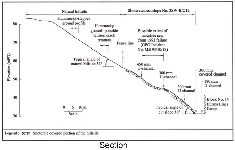 The incident involved a shotcreted fill slope exhibiting significant distress. The slope comprised a 3 m thick recompacted fill layer placed over the slope profile (with > 10 m of loose fill) in 1977. The slope was designed and checked to the required geotechnical standards in the late 1970's.