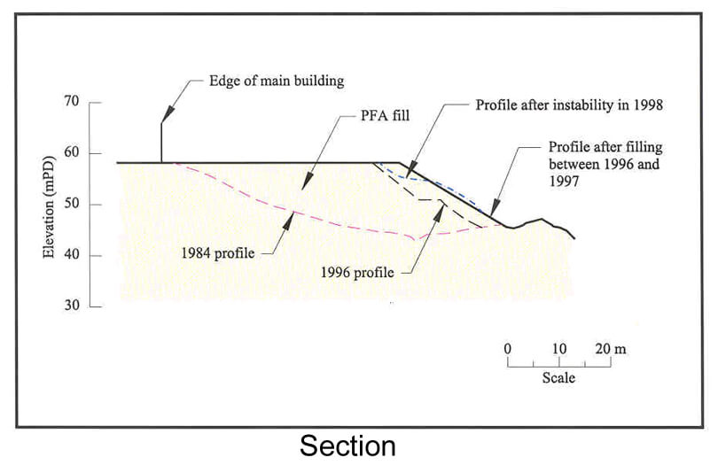 A major failure occurred in the slope in 1984. This was caused by leakage from a water main above the slope crest. The development of distress and intermittent movement since 1984 suggests that the slope was likely to have been disturbed to a greater extent than that covered by the remedial works to the 1984 failure. The previous remedial works comprised local replacement of disturbed material with compacted fill.