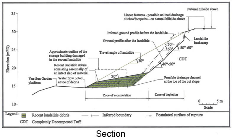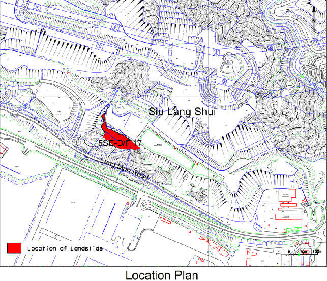 The landslides occurred in an old cut slope under heavy rainfall (estimated return period of 35 years). The slope was formed before 1961 and had a history of instability based on aerial photographs. The landslide debris inundated the eastern half of the garden nursery below and an unoccupied storage building within the licensed area was damaged. No fatalities or injuries were reported as a result of the landslide.