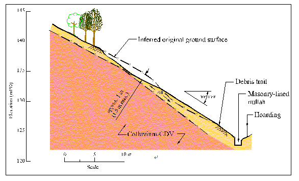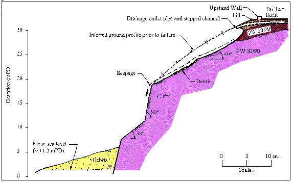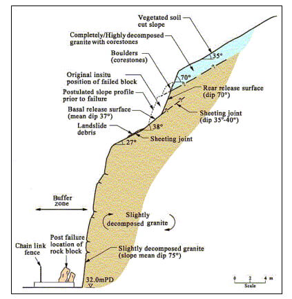 The slope has a history of failures (including a 40 m3 failure in 1992). The key contributory factors to the July 2000 landslides were the presence of adverse-orientated, highly persistent discontinuities with weak infill which had opened up through progressive slope deterioration, and root action of unplanned vegetation.