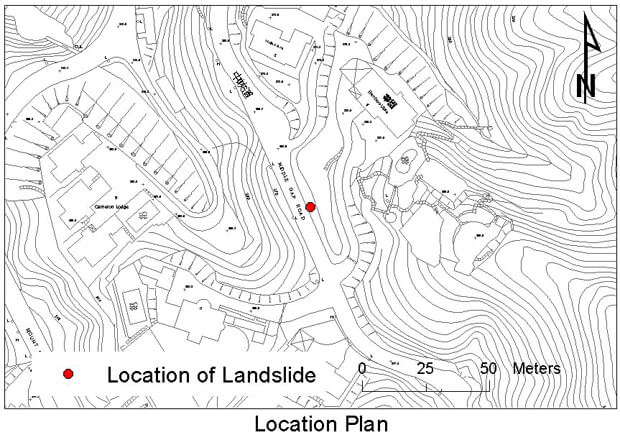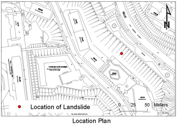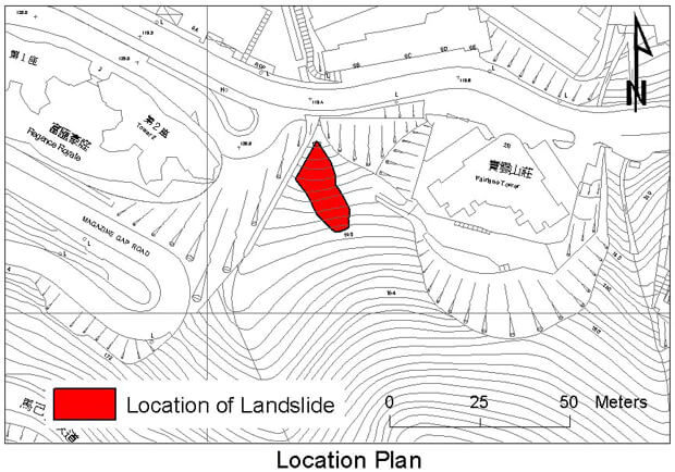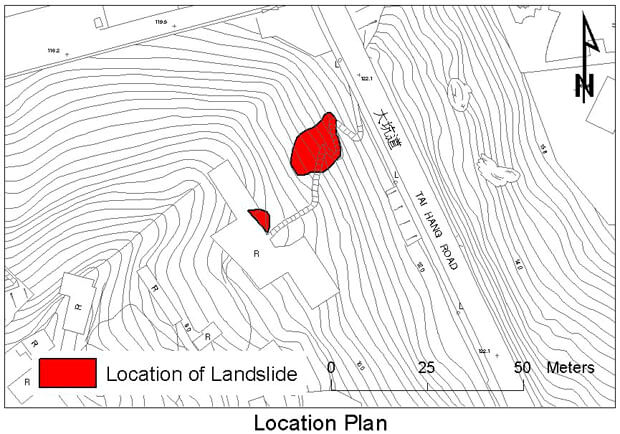 The landslide occurred in unregistered, old, loose fill deposited on a steeply-sloping terrain during heavy rainfall (return period of 50 years). Landslide debris entered into an adjacent nullah and was transported downstream to reach Hong Kong Park some 250 m away. One lane of Kennedy Road was blocked temporarily by the landslide debris. No casualties were reported.