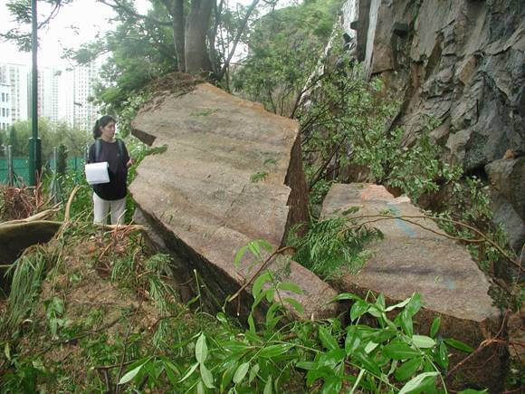 A rock block (about 3 m by 2 m by 2 m) detached from a rock cut slope above Hiu Ming Street playground during moderate rainfall. The block fell about 20 m and came to rest within a buffer zone located at the toe of the slope. Prior to this failure, a number of minor rockfalls had occurred on the slope between 1986 and 1993 and a major failure (200 m3 in volume) occurred on the slope in 1993. As a buffer zone was provided in front of the slope and fortuitously, these incidents had not caused any casualties.
