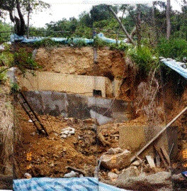 The crest concrete retaining wall, which was probably built as part of the urgent repair works following a landslide in 1979, appeared to have been constructed on a loosely compacted fill slope across a natural drainage line. An Engineer Inspection carried out in September 1999 did not identify the presence of the crest wall and poor conditions of the hard slope cover in front of the wall.