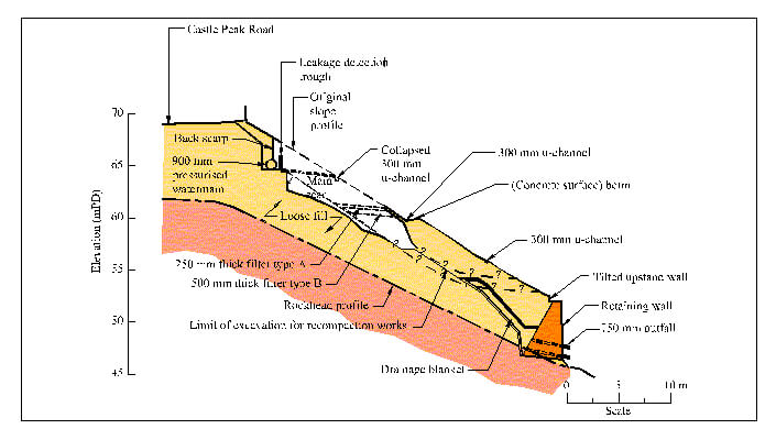 The rainstorm triggering the failure was particularly severe with almost 330 mm of rainfall recorded in the 4 hours prior to the failure (return period of about 250 years). The landslide probably involved liquefaction of loose fill below a 3.6 m high concrete retaining wall at the slope crest. Apart from direct infiltration through vegetated slope surface and the slope surface where the hard cover became dilapidated, other sources of water ingress into the loose fill possibly included leakage from broken cross-road drains which ran through the slope, leakage from cable conduits with friction fit joints which ran along the slope crest and sub‑surface seepage through the loose fill material.