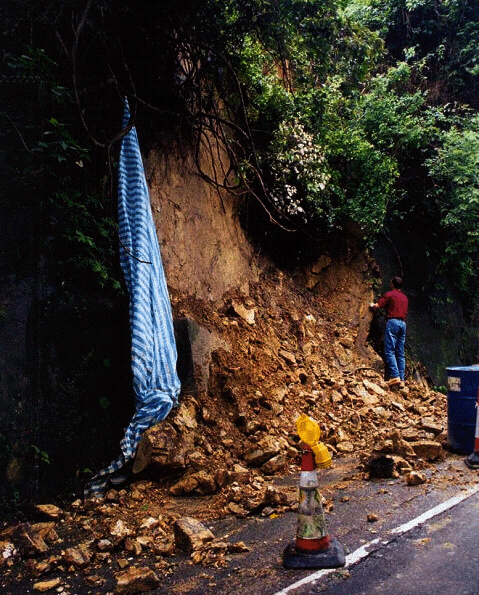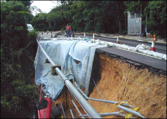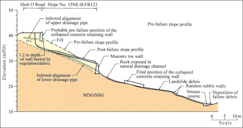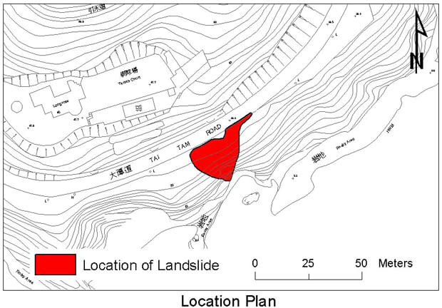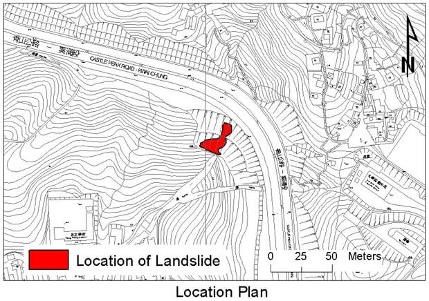 The 300 m3 landslide occurred on a pre-1977 loose fill slope (No. 15NE-D/FR123) which crossed a natural drainage line at the landslide location. The landslide caused temporary closure of Shek O Road, thus, cutting off the sole access to Shek O Village and Big Wave Bay. An unoccupied taxi fell into the landslide scar. The landslide debris travelled downslope into a stream course and its outwash was subsequently deposited onto the golf course of the Shek O Country Club. No casualties were reported.
