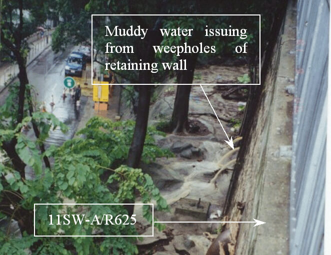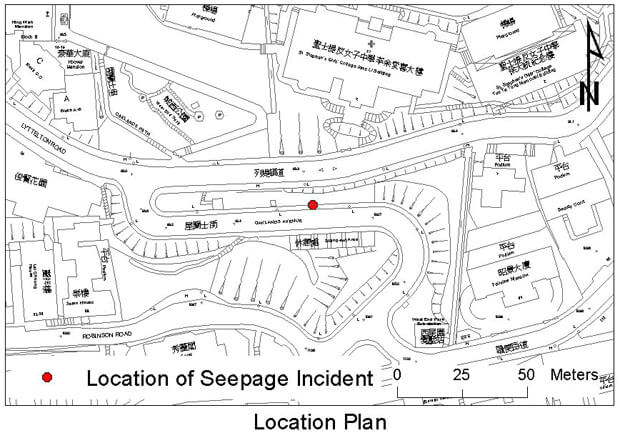 The incident involved significant leakage from a defective stormwater drain underneath fill slope No. 11SW-A/FR12 (between Robinson Road and Oaklands Avenue), leading to subsurface erosion of the fill slope and ground subsidence behind the slope crest as well as strong outflow of muddy water from the weepholes of retaining wall No. 11SW-A/R625 (between Oaklands Avenue and Lyttelton Road). As a result of the incident, both lanes of Oaklands Avenue and the westbound lane of Lyttelton Road were temporarily closed.