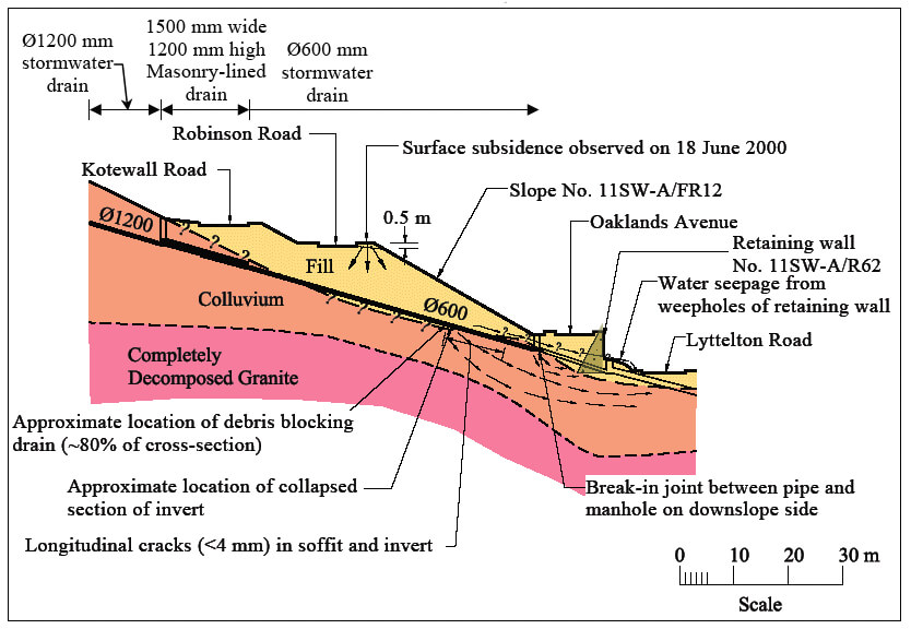 CCTV surveys of the 600 mm stormwater drain carried out following the incident revealed that defects (collapsed invert and break at a joint) were located in the section of the drain underneath slope No. 11SW-A/FR12 and at the connection to a manhole at Oaklands Avenue. Seepage water from the broken drain was probably directed to the back of retaining wall No. 11SW-A/R625 along a network of erosion pipes within the colluvium and resulted in outflow of muddy water from the weepholes.