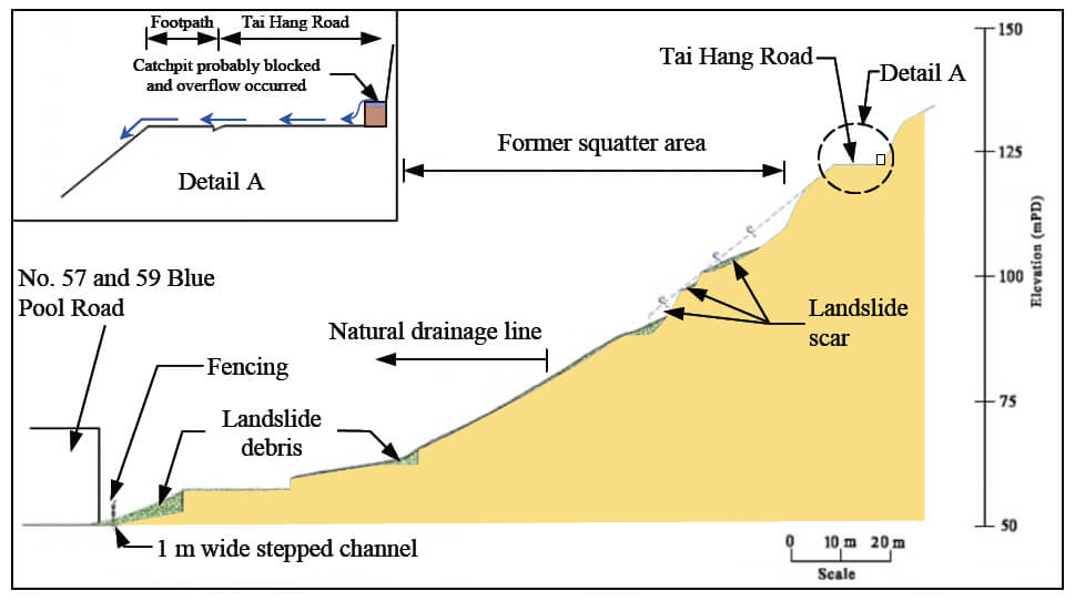 A cluster of five landslides occurred on a disturbed hillside (with volume ranging from 10 m3 to 250 m3, part of which was formerly a squatter area, below Tai Hang Road. The landslide debris entered a natural drainage line. The outwash material of the landslide reached the car parking areas underneath a row of residential blocks on Blue Pool Road below the hillside. No casualties were reported.