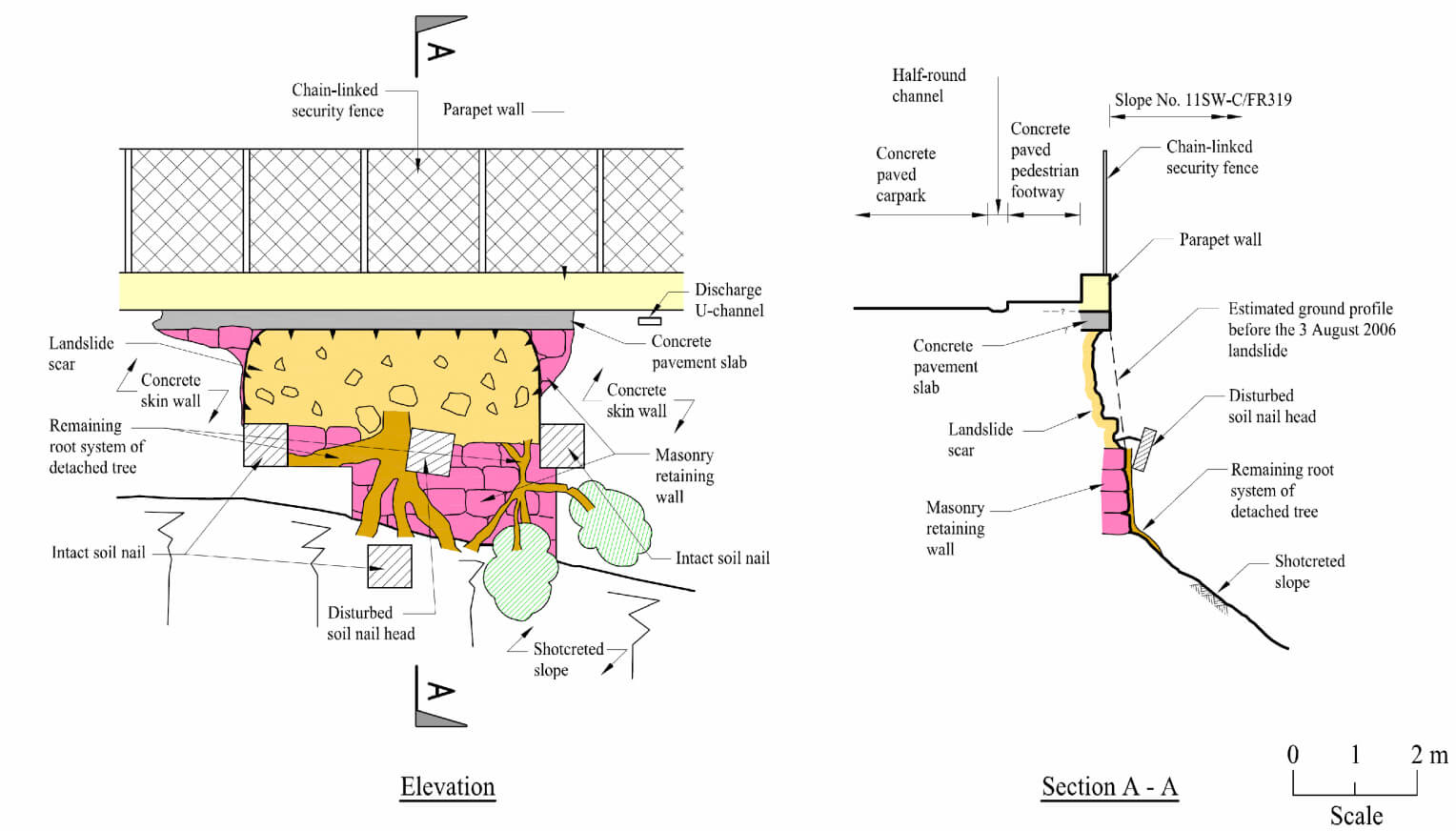 The minor failure (4 m3 in volume) principally involved the detachment of a mature tree and parts of a masonry wall of private ownership during a typhoon with fairly light rainfall. Although the incident occurred on an engineered slope feature, the landslide is of no technical interest in terms of the nature of the failure.
