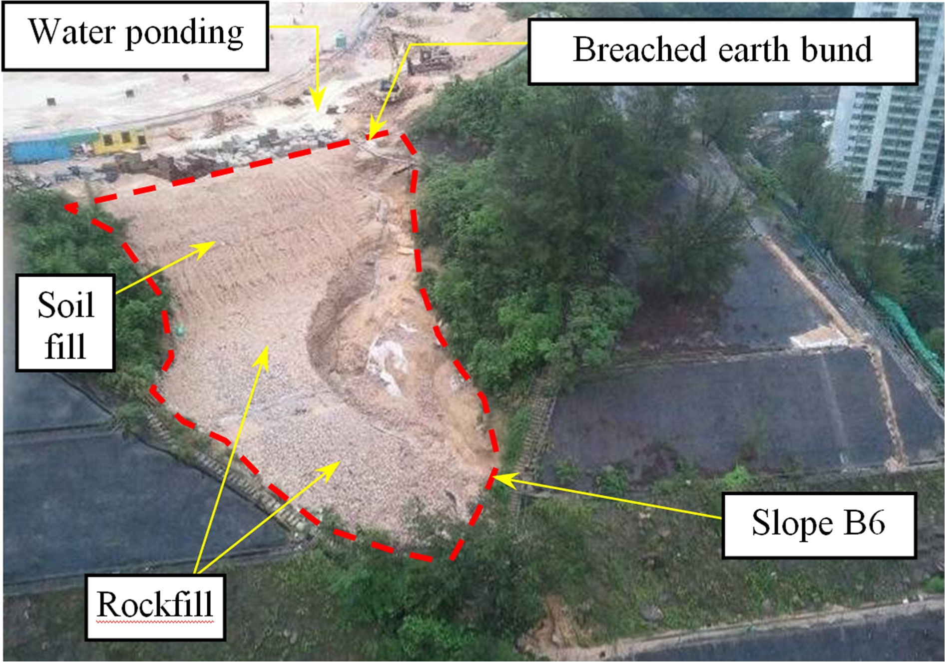 The crest of Slope B6 was located at a topographical low point of an extensive catchment area comprising mainly the northwestern portion of the DAR site. Prior to the failure, a 1 m high temporary earth bund had been formed along the crest of Slope B6 to prevent overspill. A 225 mm diameter pipe was installed at the bund to discharge surface runoff accumulated at the crest of Slope B6 to the surface drainage system of an adjacent slope feature.