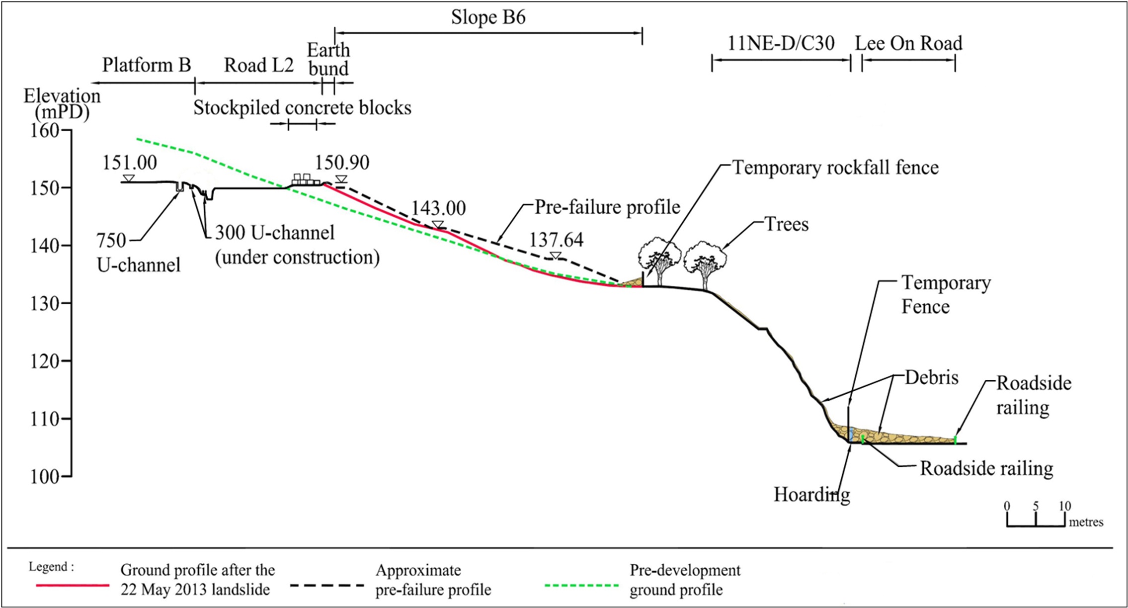 In the early morning of 22 May 2013, a landslide incident (Landslide Incident No. 2013/05/1293) occurred within the construction site for the Development at Anderson Road (DAR), above Lee On Road, Sau Mau Ping. The landslide occurred on fill slope B6 which was under construction at the time of the incident. The landslide involved a failure volume of 530 m3 with the majority of the failure debris deposited on Lee On Road.