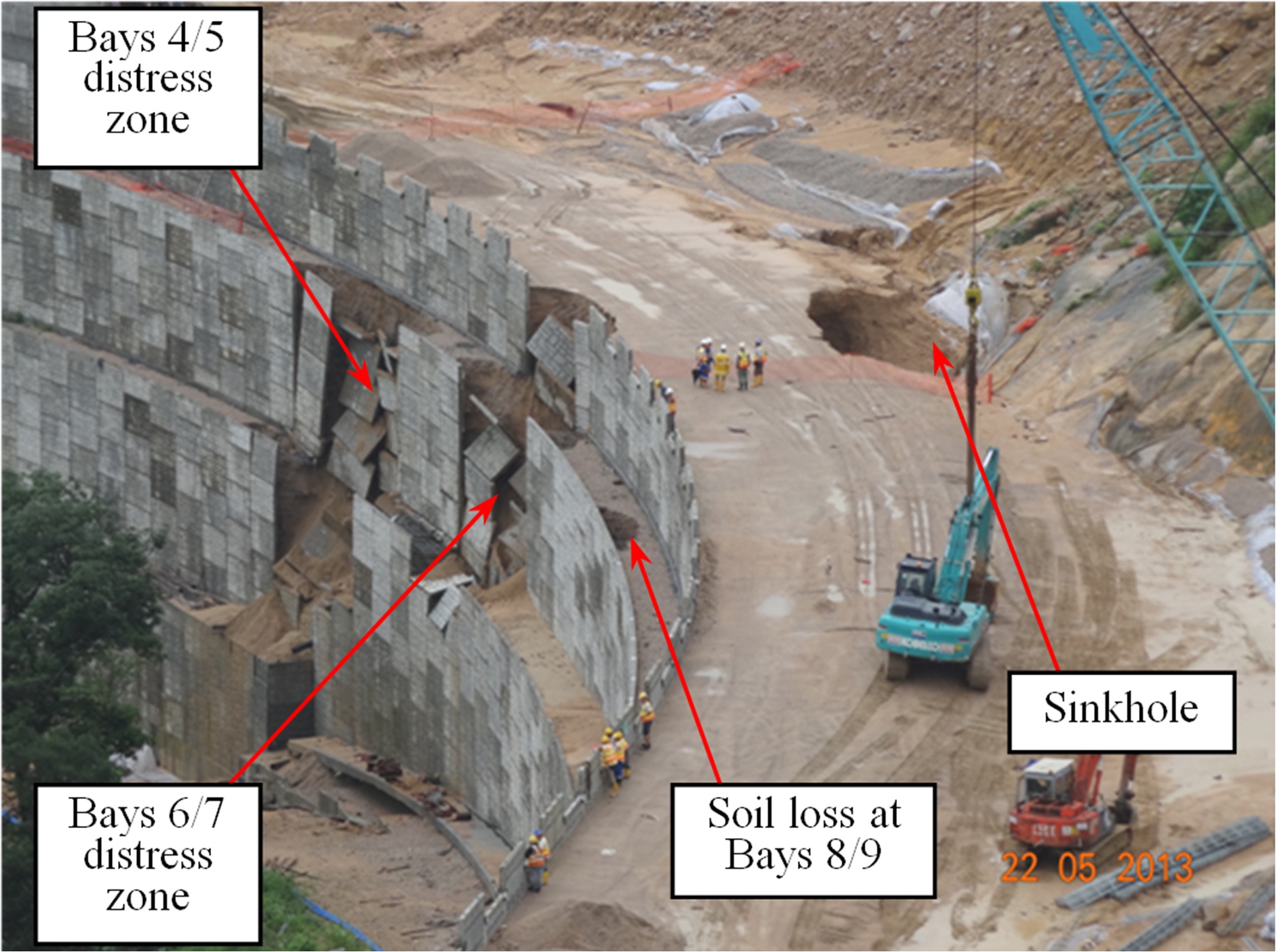 In the early morning of 22 May 2013, a distress incident (Incident No. 2013/06/1367) occurred on a reinforced earth wall (R22) within the construction site for the Development at Anderson Road (DAR), above Shun On Road, Sau Mau Ping. The incident involved dislodgement of 78 facing panels with a total soil loss of 1,300 m3. The distress occurred at three localised areas (viz. Bay 4 and 5, Bay 6 and 7 and Bay 8 and 9). A sinkhole was found at the backyard of Bay 6 and 7.