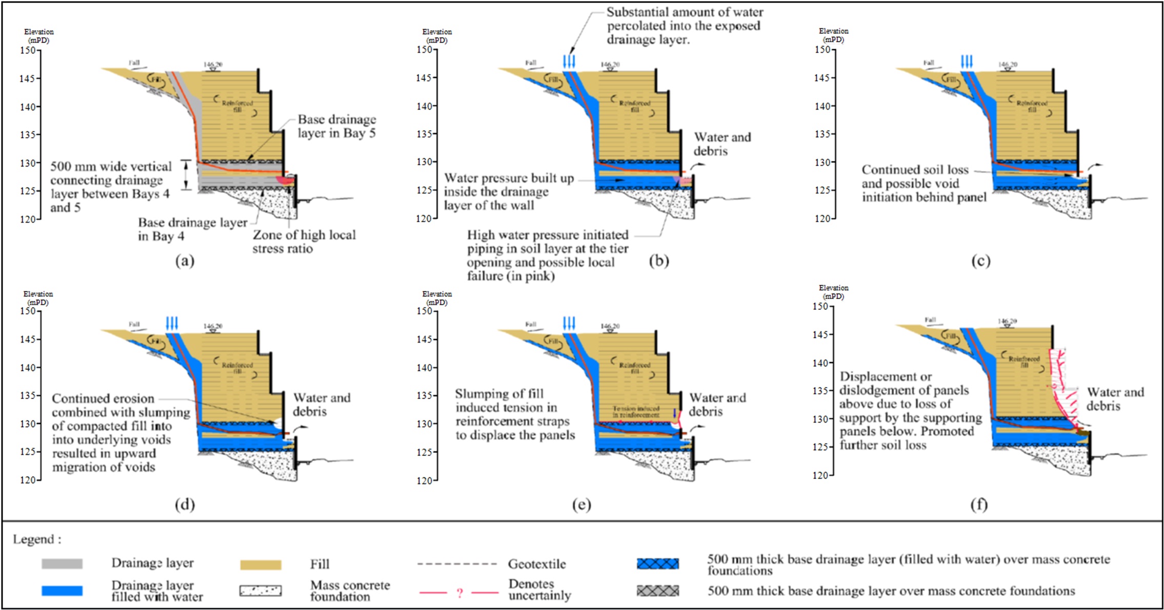 This led to excessive ingress of surface runoff to the wall via an exposed drainage layer at the backyard of the wall. High water pressure could build up at and in the vicinity of the drainage layer near the wall face. The high water pressure would have initiated piping at the tier openings at the three locations of the wall where the overburden pressure was low. This was followed by soil loss and resulted in panel dislodgement in two of the three locations.