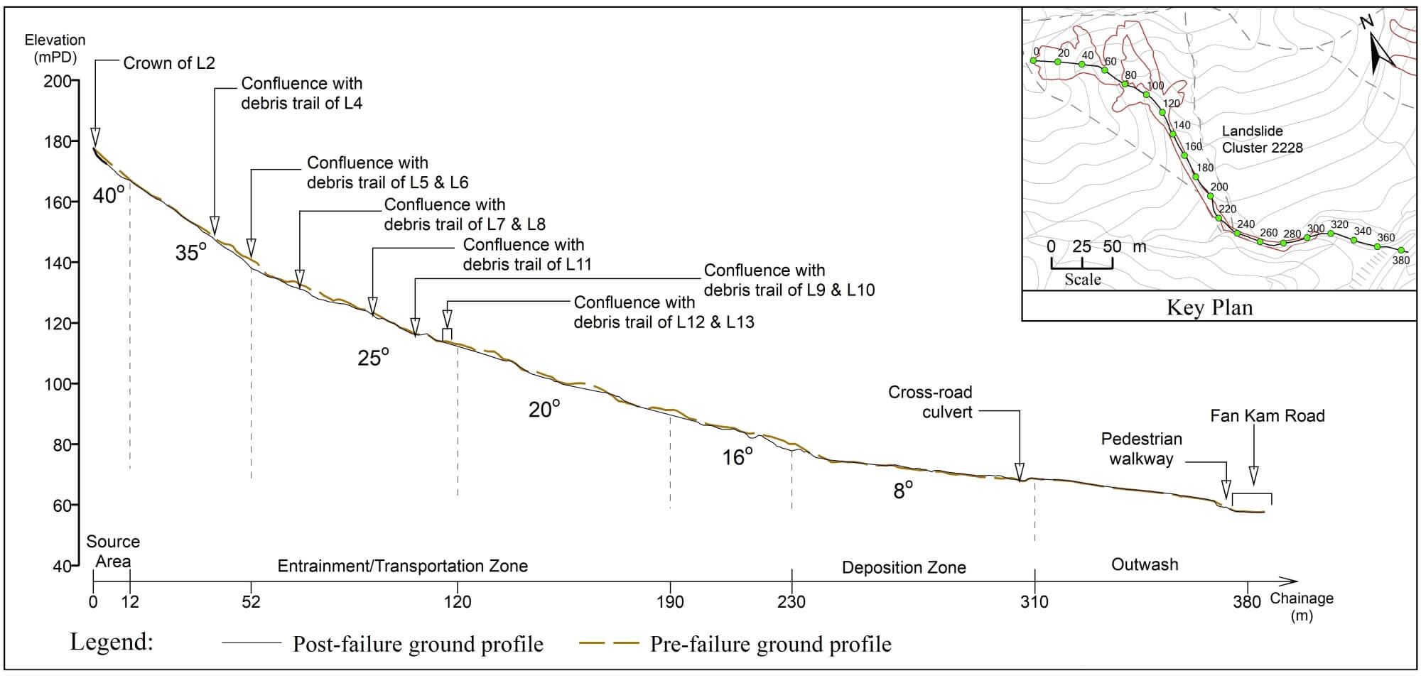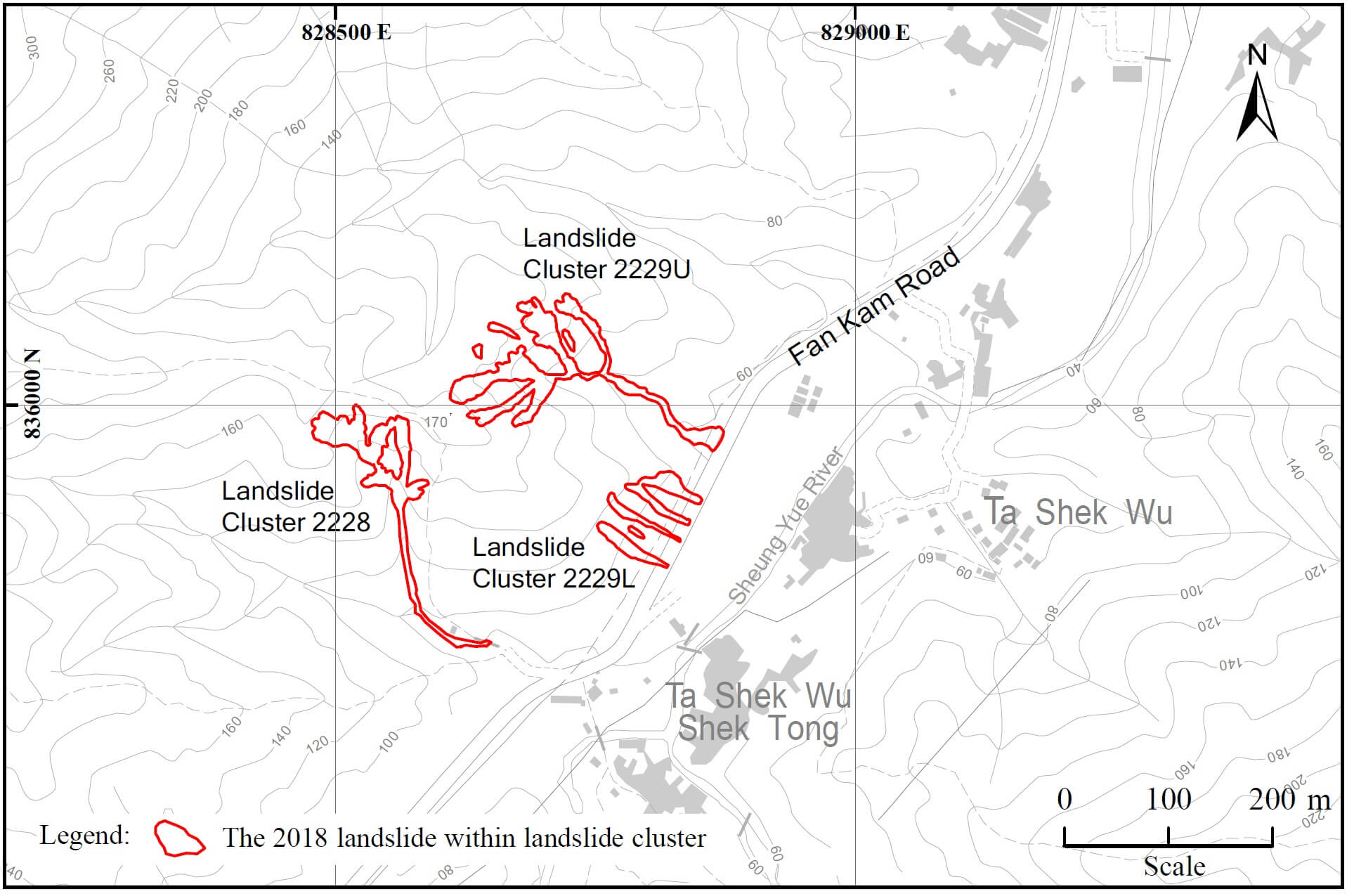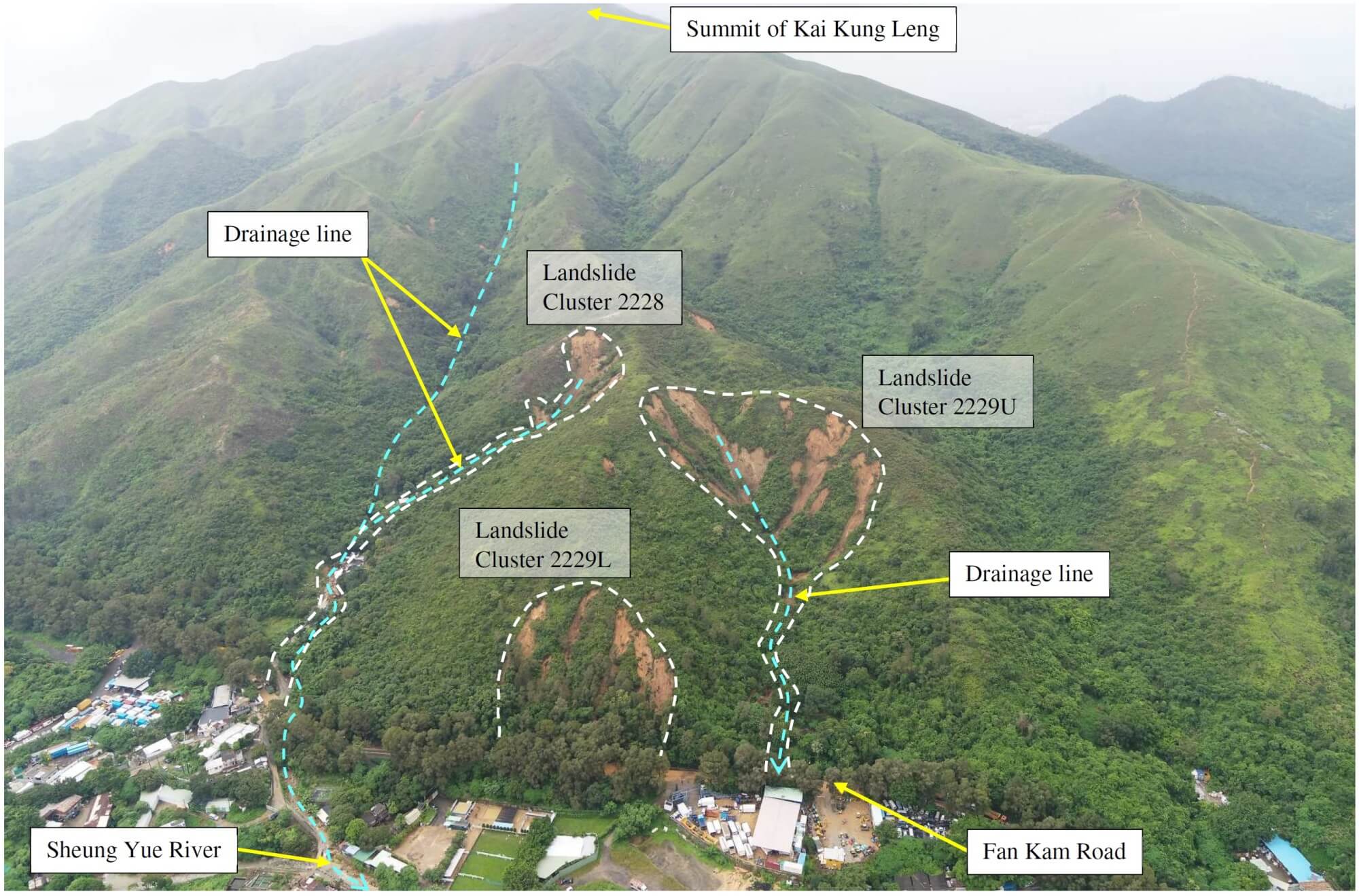 On 29 August 2018 while Landslip Warning was in effect, landslides in three distinct clusters, denoted as 2228, 2229U and 2229L, occurred on the natural hillside above Fan Kam Road with total source volume ranging from 200 m3 to 800 m3 (Incident Nos. 2018/08/2228 and 2018/08/2229). The landslides typically initiated as open hillside failures from multiple source areas within the landslide clusters. Debris from most of the source areas at landslide clusters 2228 and 2229U converged into drainage lines and turned into fairly mobile channelised debris flows descending towards Fan Kam Road, with a runout distance of about 300 m excluding outwash debris. The landslide debris mostly came to rest before reaching Fan Kam Road but outwash debris inundated both lanes of the road resulting in temporary road closure among other consequences.